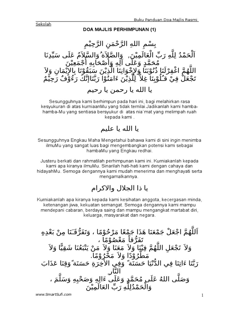 Tidak juga lupa kepada para pendidik yang telah lama menyumbang khidmat dan menabur bakti mereka di sekolah yang bertuah ini. DOA MAJLIS PERHIMPUNAN 1 بسم ال الرحمن الرحيم. Masa berdoa bagi majlis rasmi atau separuh rasmi sebaik-.